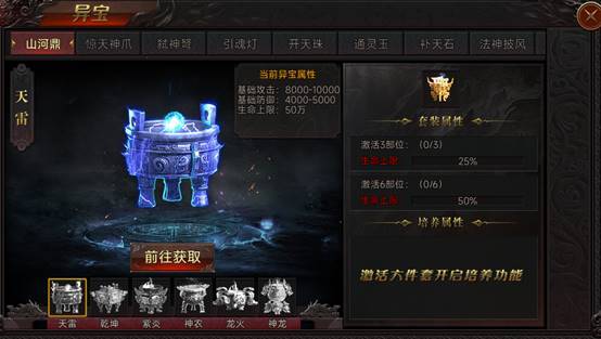 每类异宝都有6种,激活可增加大量属性,更有套装百分比属性。