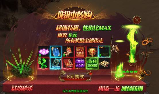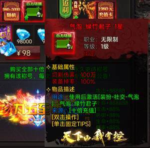 980~5000元充值卡,10倍钻石返利,高级群攻技能自选,百万切割聊天气泡:个性+打怪两不误