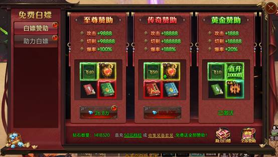 获得 10 倍钻石、解锁全部赞助档位、直升 50 转,打怪效率+1000%