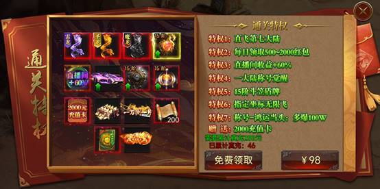 直飞第 7 大陆、雷龙、圣龙、魔龙三龙起飞刷怪哇哇快、时装:靓仔炸街:每日登陆可随机获得500~2000元红包、称号、2000元充值卡、千万级元宝、直播间收益永久提升60%,永久传送等等其他高价值奖励。